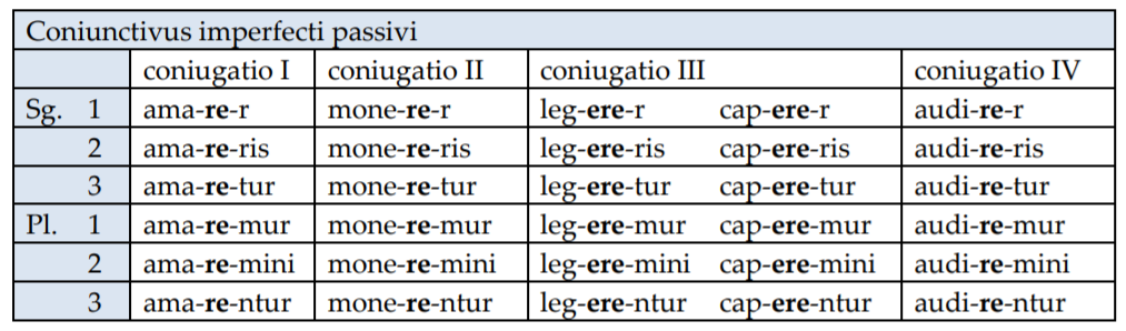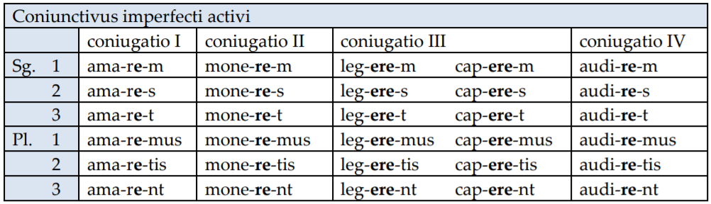 Coniunctivus imperfecti се образува, като към сегашната основа на глагола се прибави характеристиката -re- и личните окончания. При глаголите от трето спрежение пред характеристиката -re- се явява съединителната гласна -e-. Coniunctivus imperfecti практически се образува като към infinitivus praesentis activi се прибавят личните окончания за съответния залог.